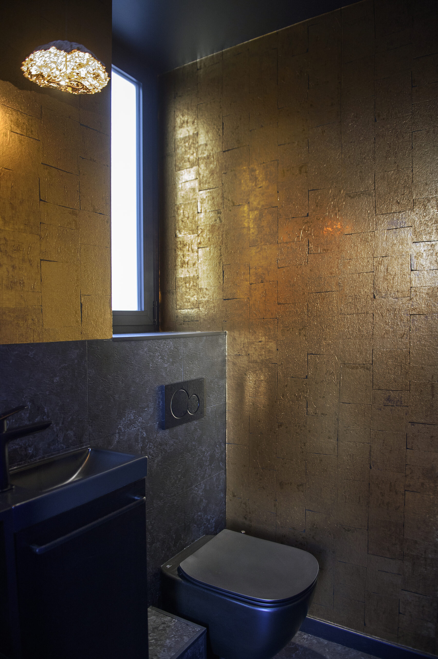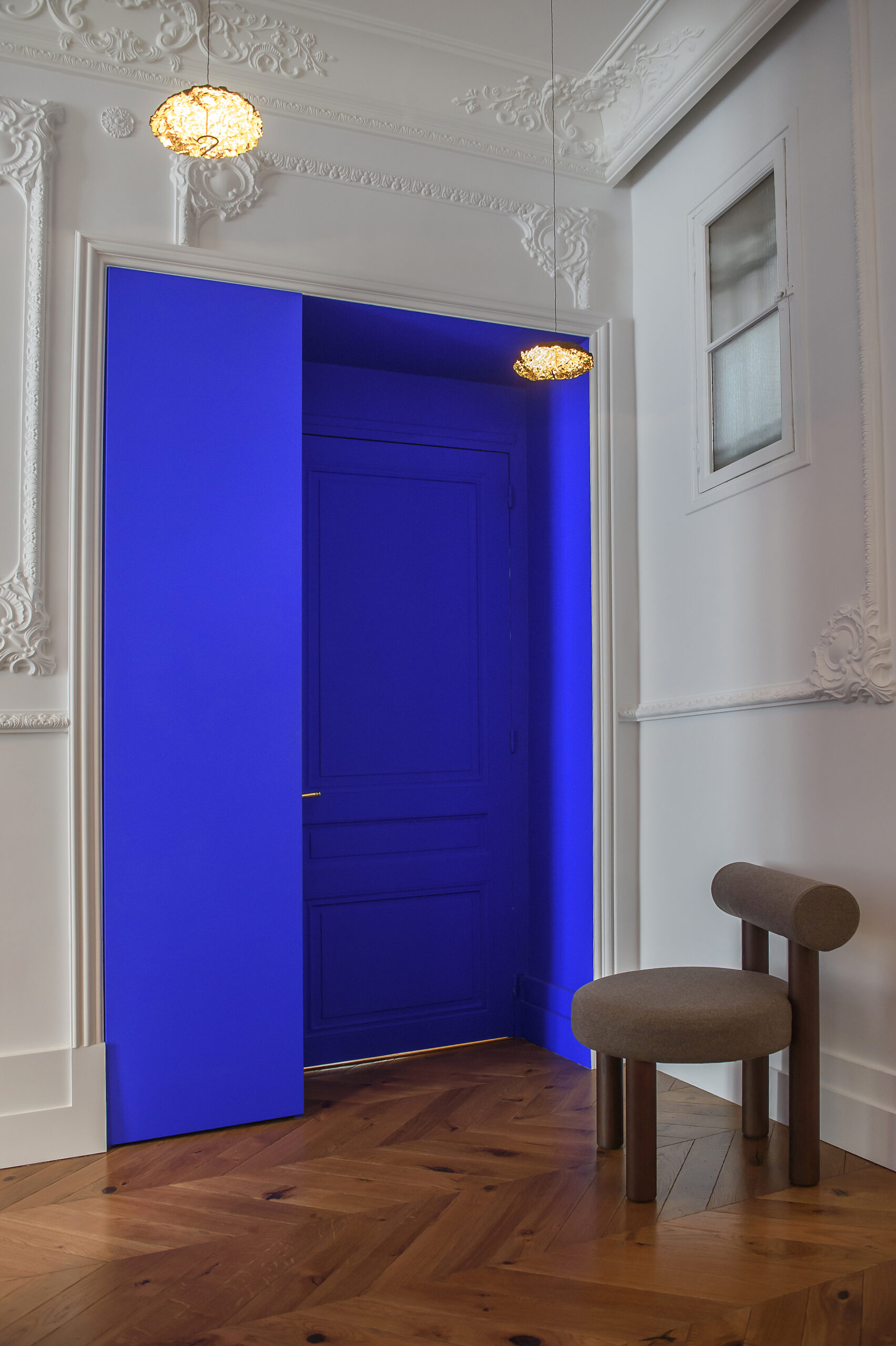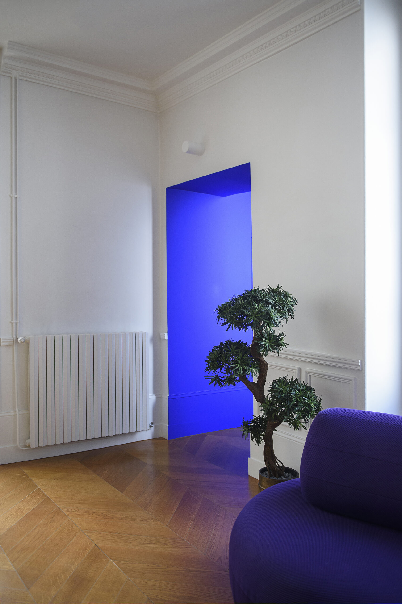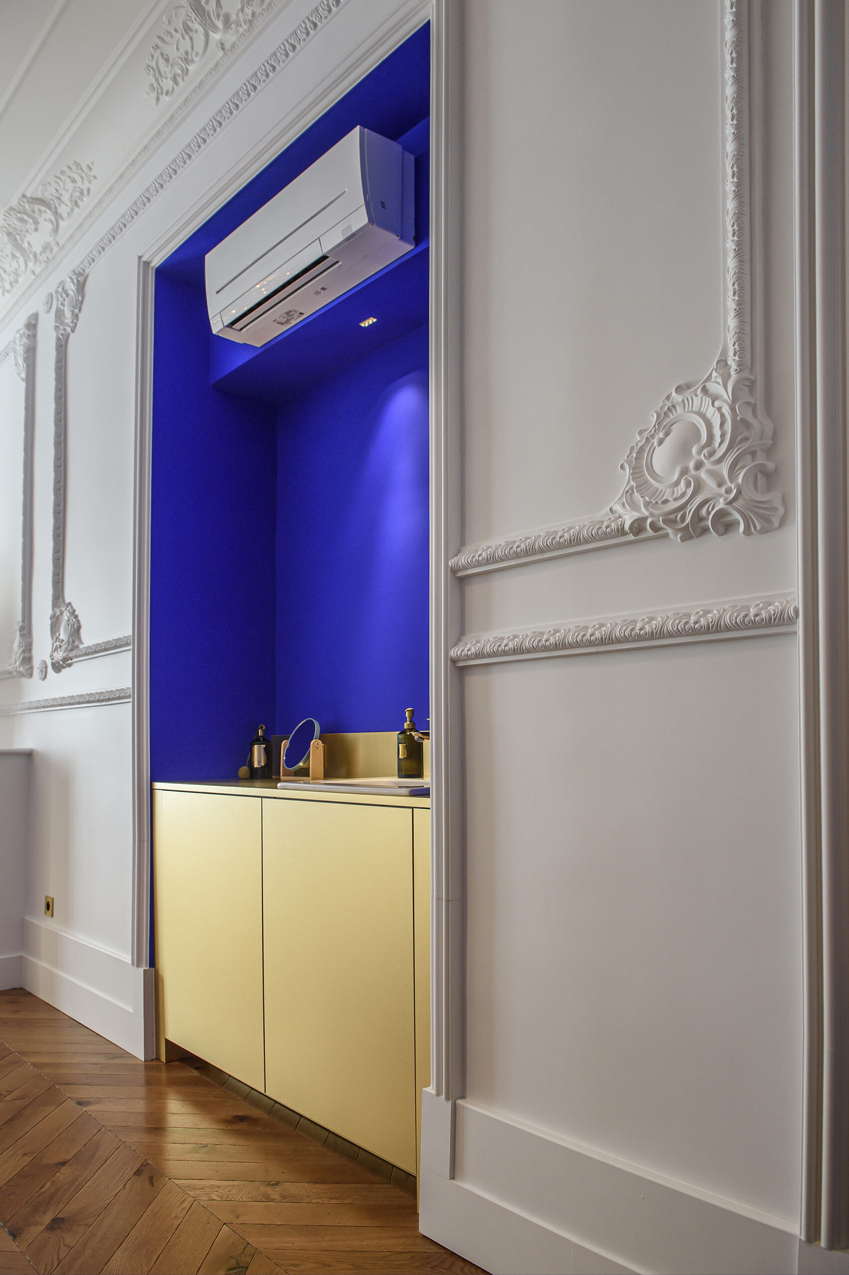Sur les murs lisses, les cimaises et les panneautages de chez ORAC forment un calepinage digne des plus grands Haussmanniens. On retrouve ces profils appliqués au plafond formant un encadrement au bords arrondis. D’un point de vue technique, nous avons revu l’’ensemble de l’installation électrique, caché le tableau électrique et le compteur de gaz dans un placard. Le coté fonctionnelle n’est pas en reste avec un linéaire de paillasse stratifié laiton.