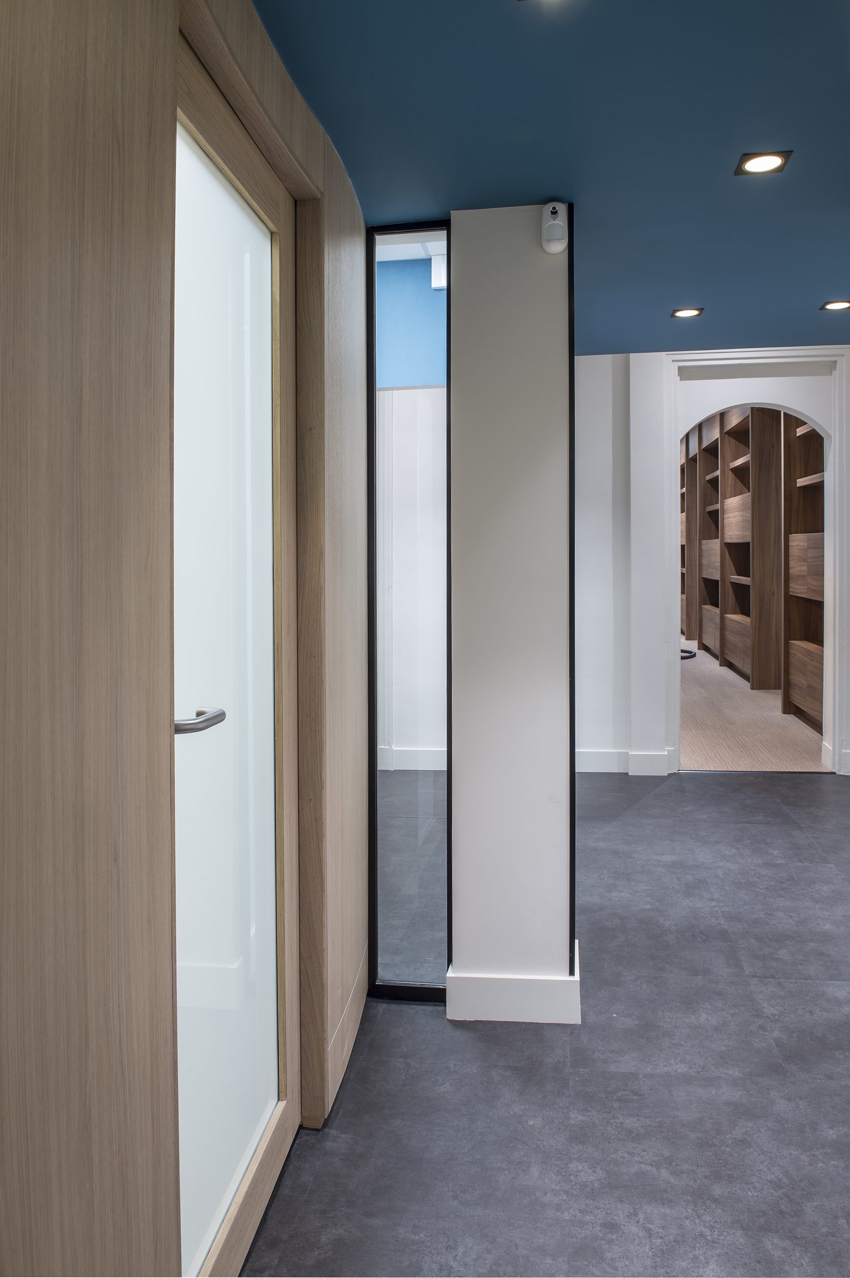 De nouvelles cloisons cintrées revêtu de parement en bois prennent place au centre du projet. Nous y avons intégré des portes étudiées dans les moindres détails pour une parfaite intégration.