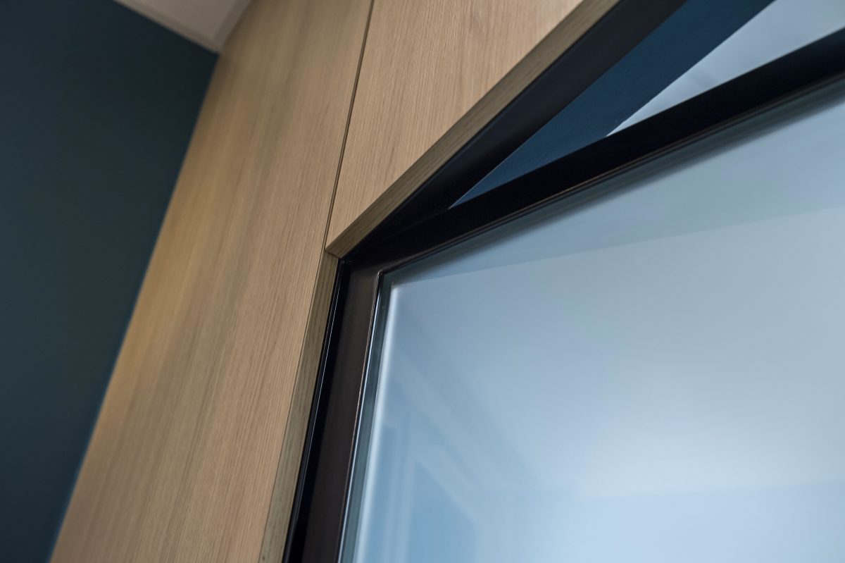 Dans l’accueil un espace de réception est isolé de la zone d’entrée par une verrière d’angle souligné par une structure en serrurerie noir. Ces éléments ont été intégralement préfabriqué en atelier afin d’optimiser la durée du chantier.