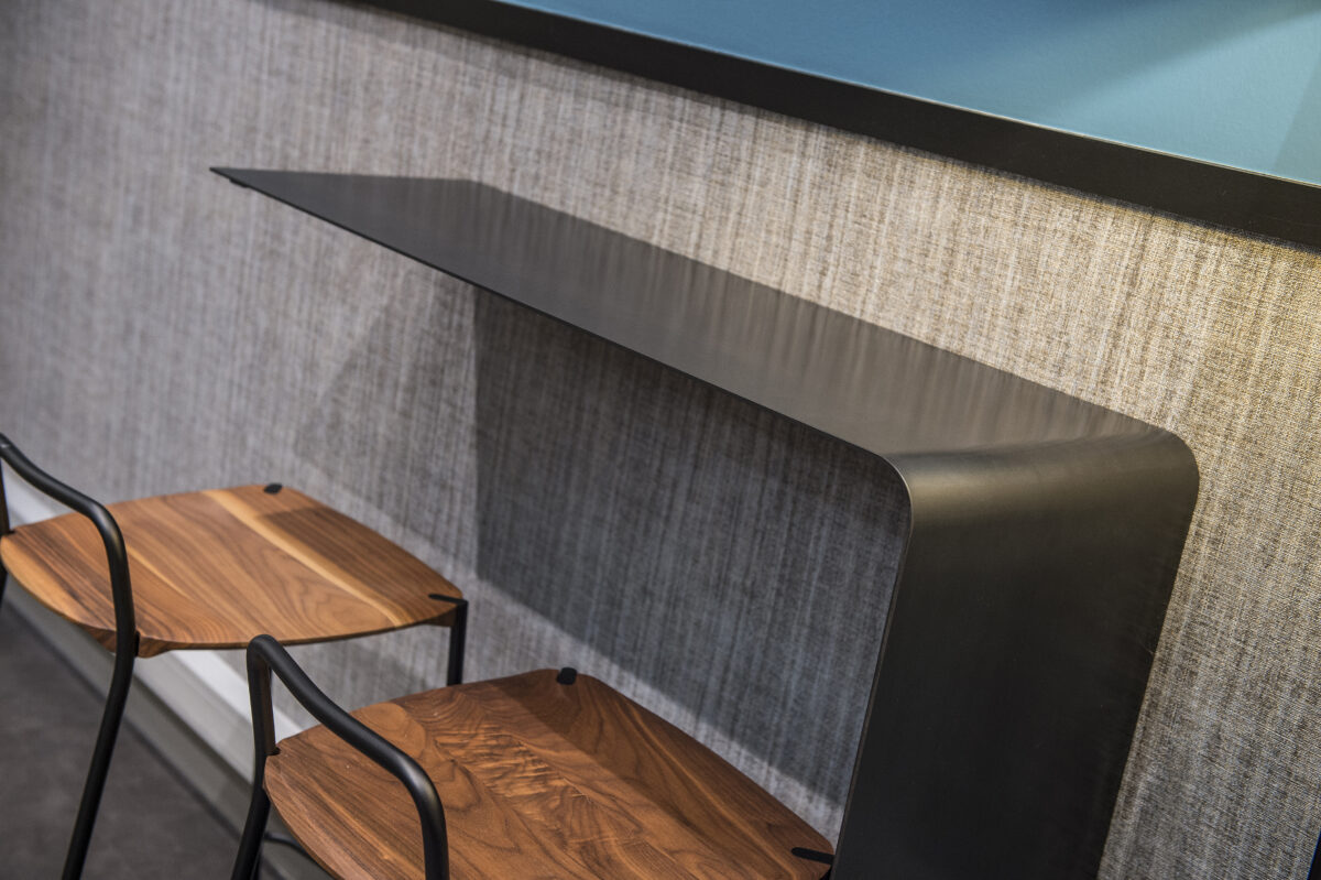 Wing Shelf est constituée d’une seule feuille d’acier courbée qui se fixe au mur grâce à un système invisible, permettant de ne pas dénaturer l’effet graphique de l’ensemble. L’extrême finesse de la feuille de métal lui confère une légèreté impressionnante. Matériau brut, elle s’inscrit dans l’esprit de la verrière dans laquelle elle est situé.