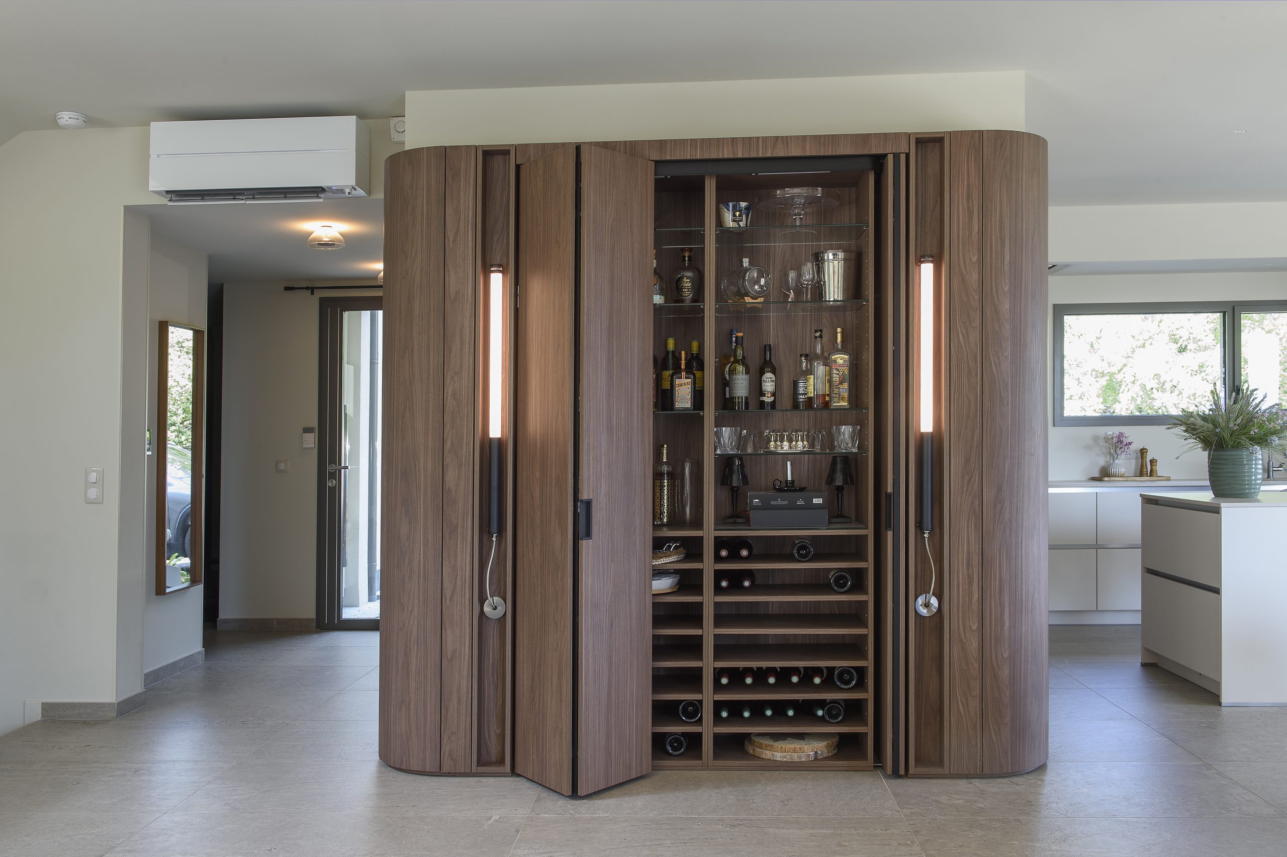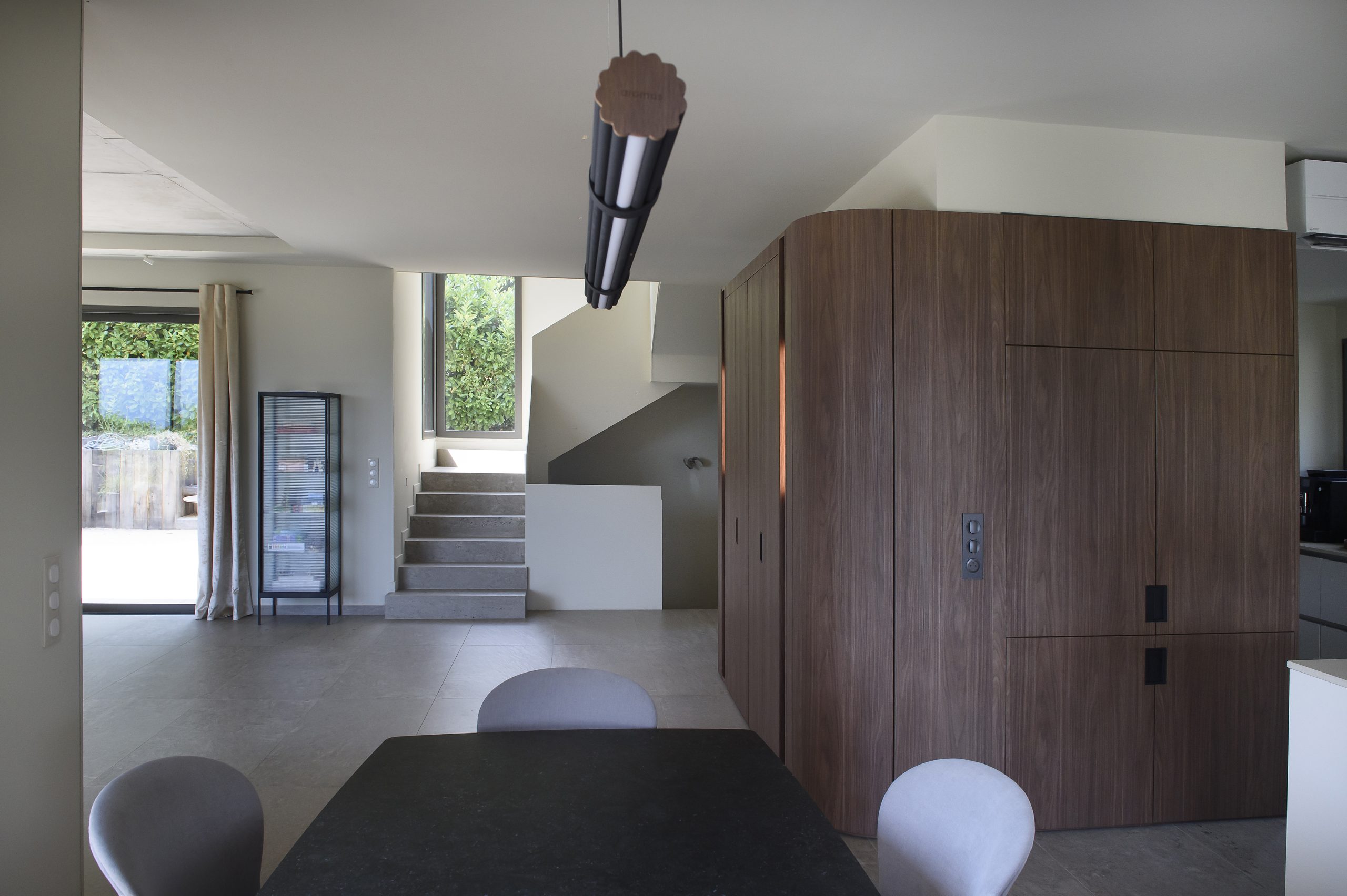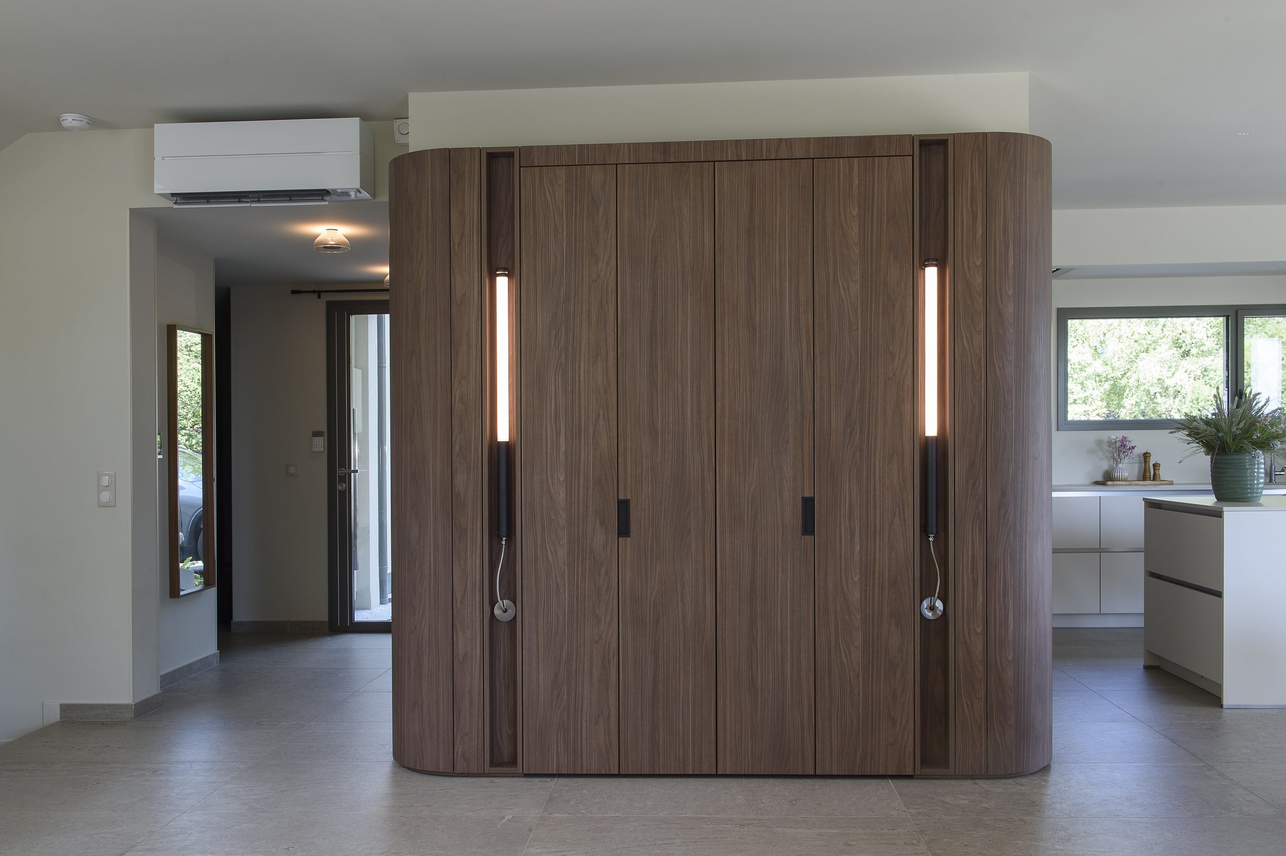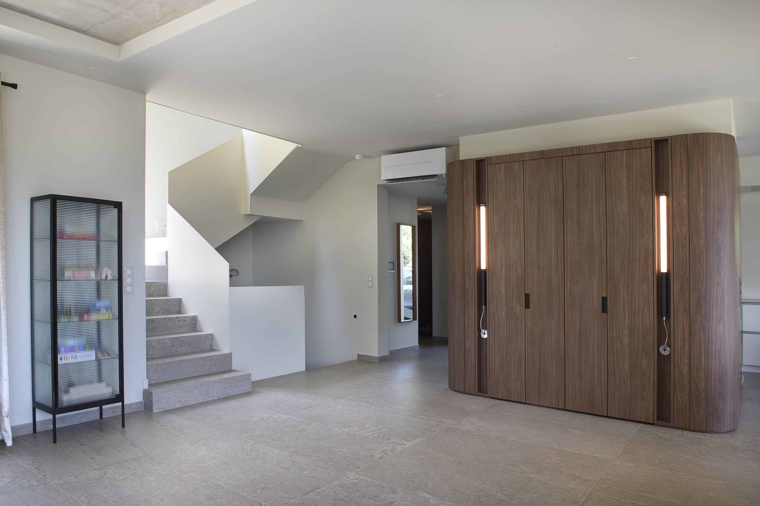 Les agencements en noyer ressortent sur une palette de fond claire allant des tons gris au beige