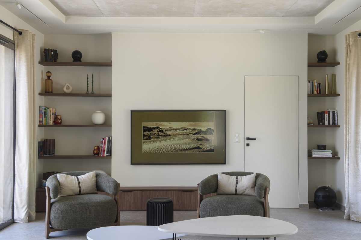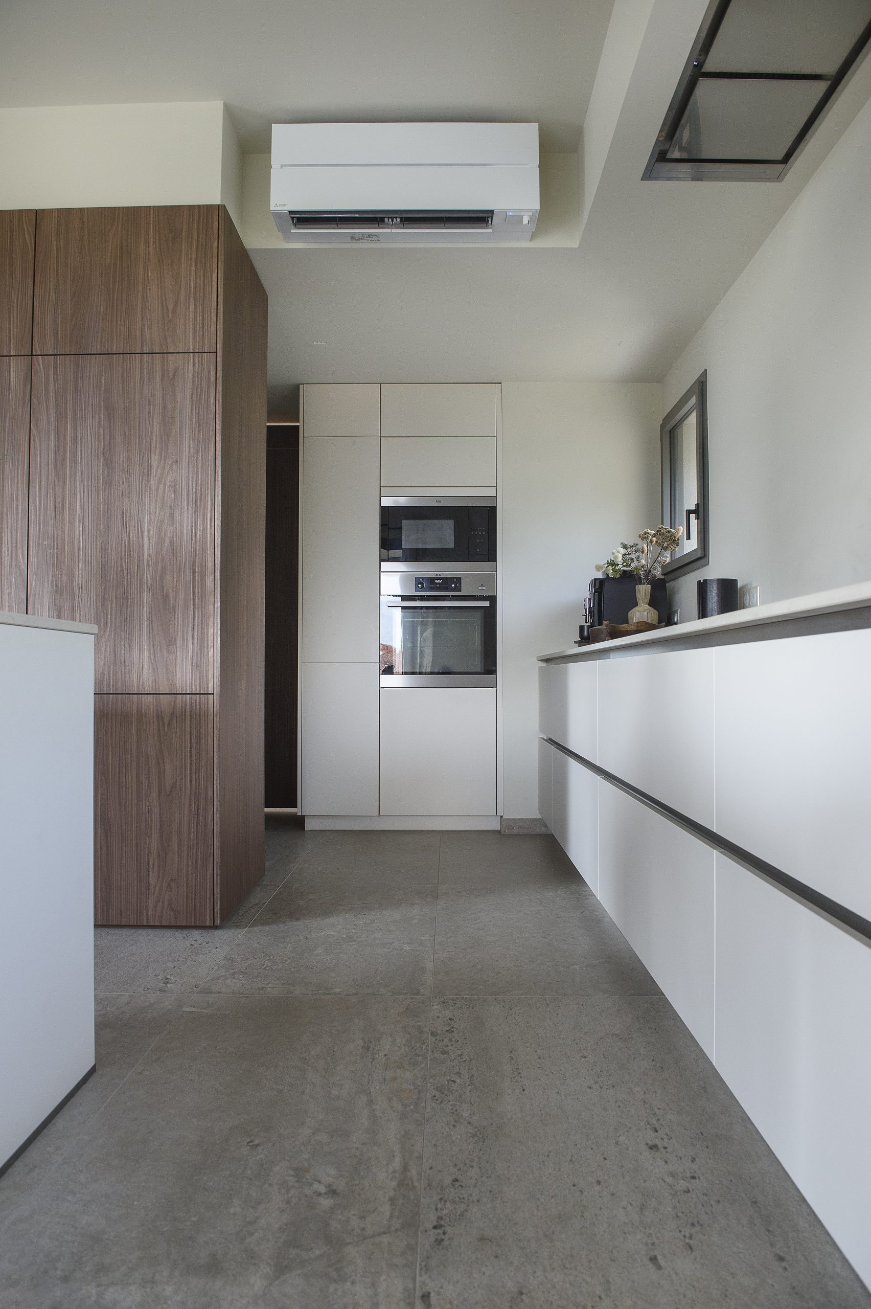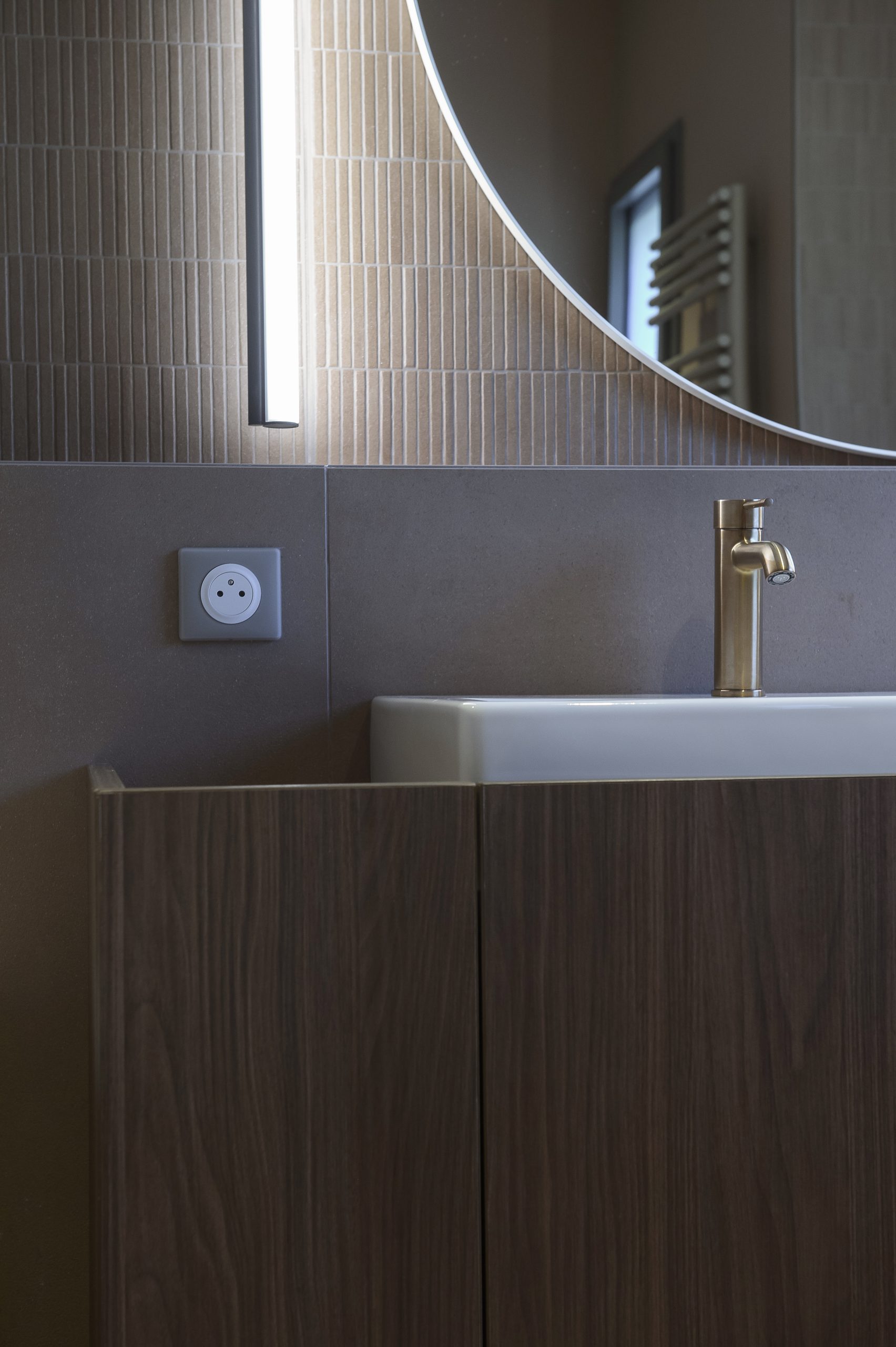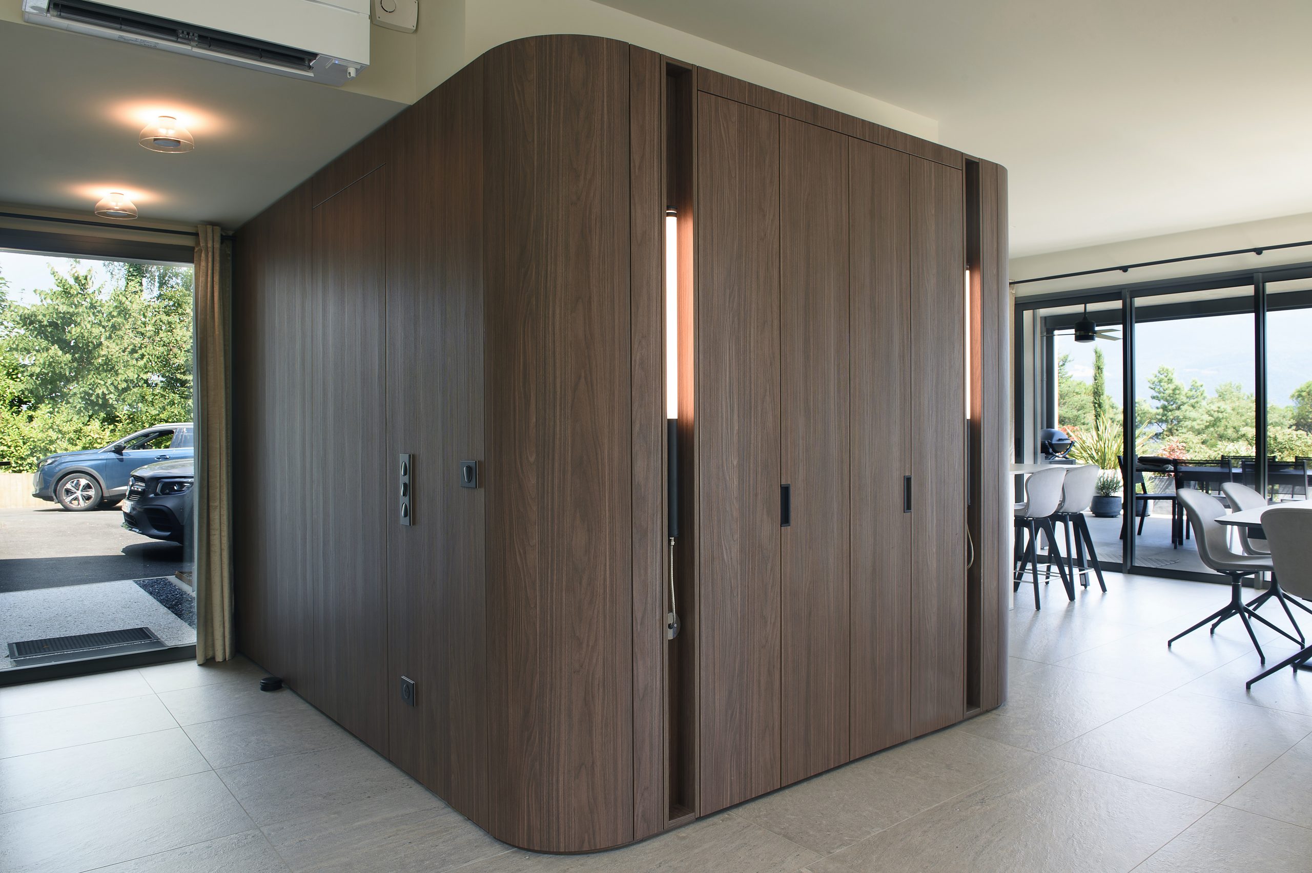 Les agencements en noyer ressortent sur une palette de fond claire allant des tons gris au beige