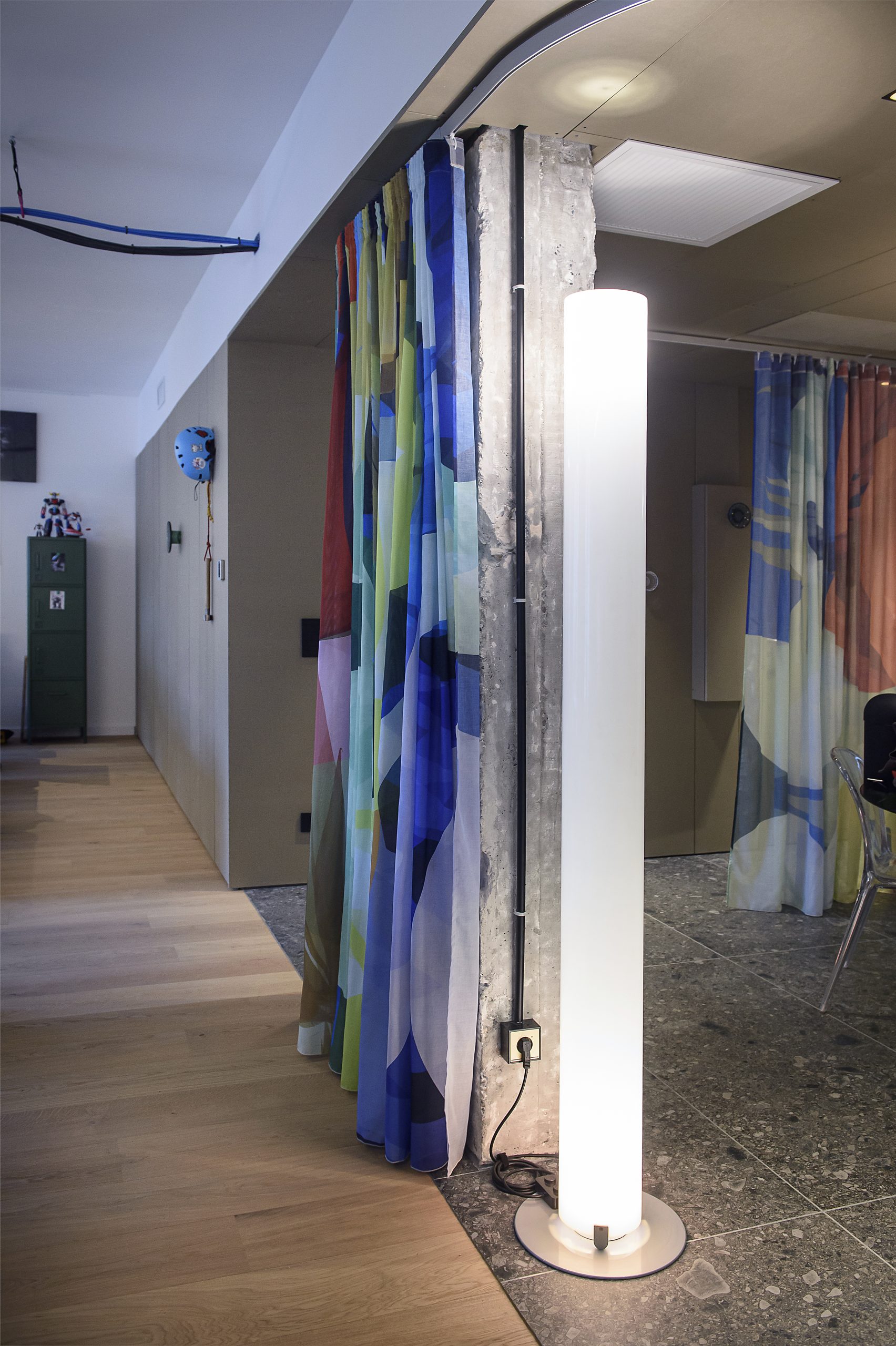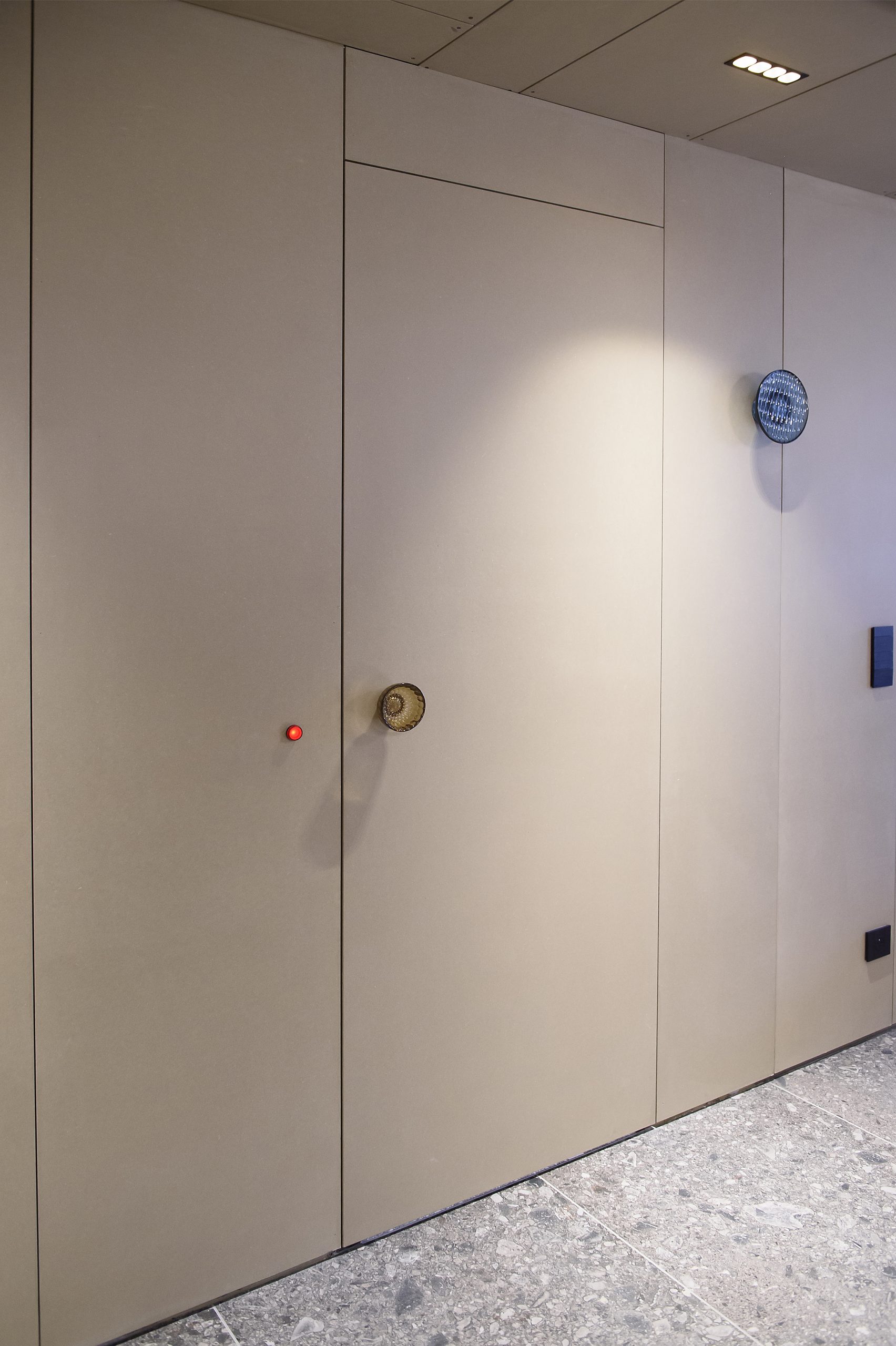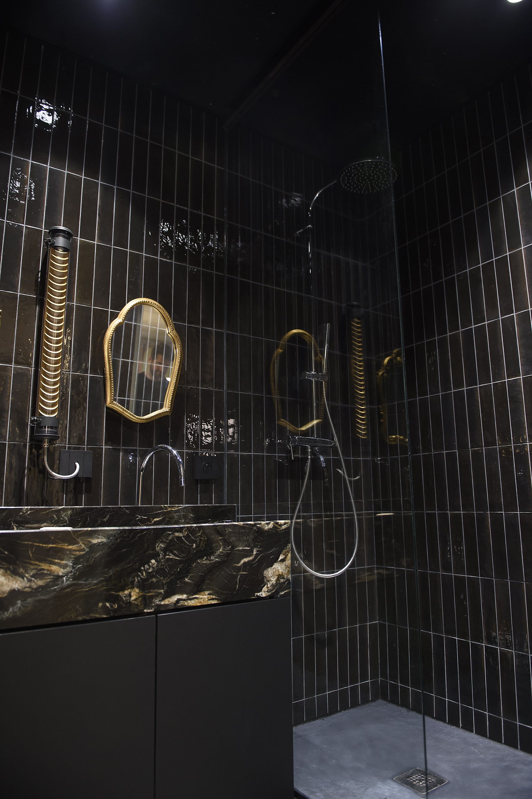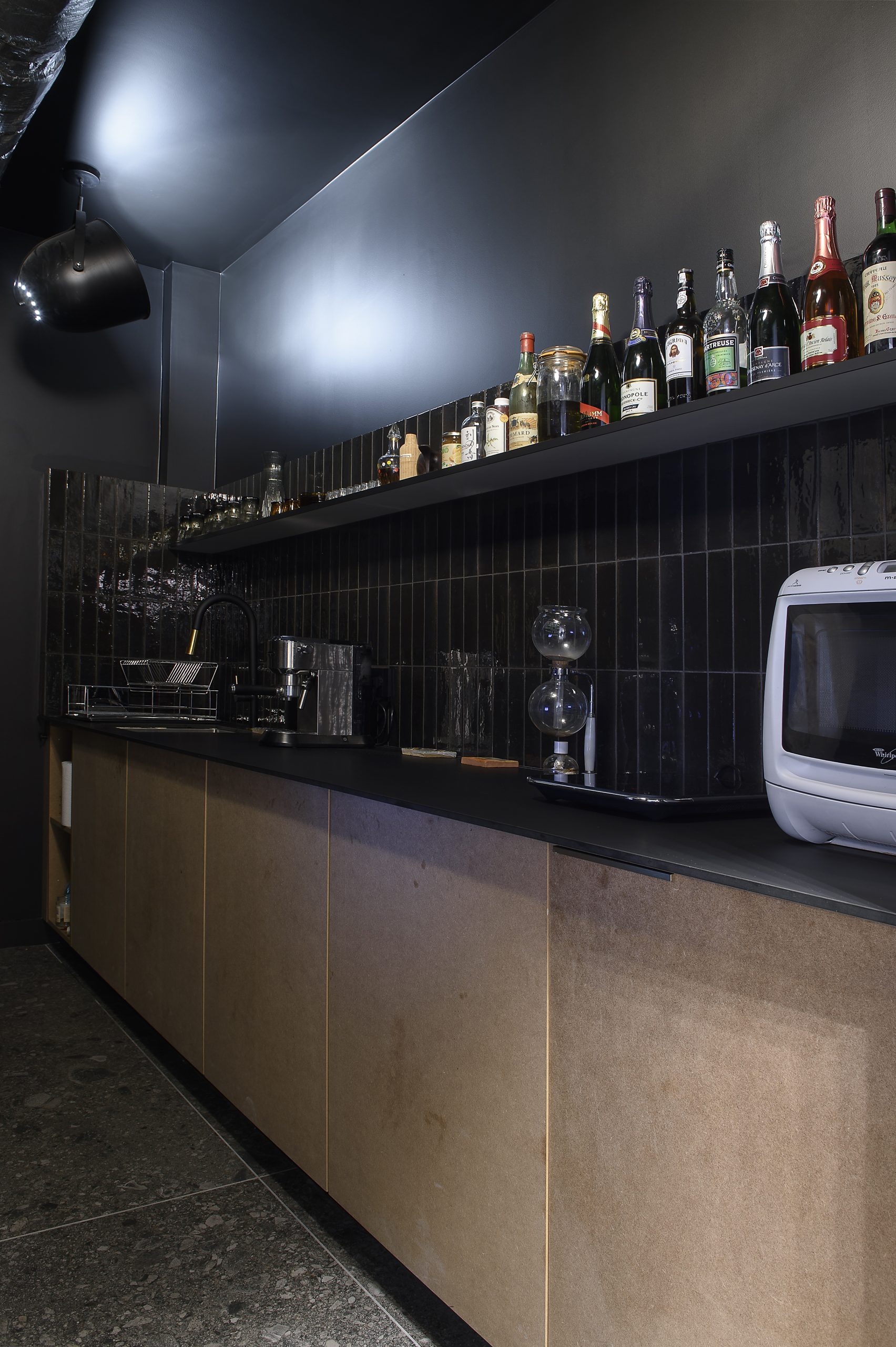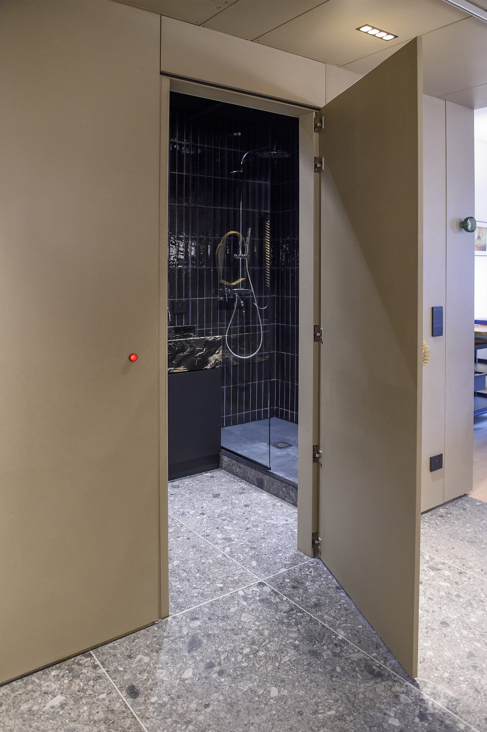 La cuisine fait face à la salle de bain et aux sanitaires. L’intérieur de ces 3 pièces techniques sont traités comme des boites noires.